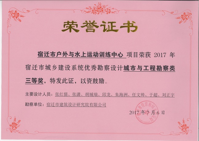 2、宿遷市戶外與水上運動訓練中心項目中獲城市與工程勘察類三等獎